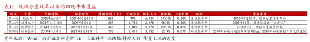 2005年4月国家开启股权分置改革以来,A股市场共经历4轮牛市,前3轮为“系统性牛市”,上涨斜率陡峭,呈现“快”牛特征;第4轮为“结构性牛市”,上涨斜率较为平缓,呈现“慢”牛走势。市场改革和流动性宽松或为主要催化因素。第一轮被称为“股改牛”,从2005年6月6日开始,至2007年10月16日结束,上证指数从998点最高上涨至6124点,期间最大涨幅超5倍,持续时间为862天。第二轮“四万亿牛”启动时间为2008年11月9日,在国际金融危机给我国经济带来巨大下行压力的情况下,国务院提出了投资4万亿元刺激经济的方案。本轮牛市从2008年11月10日开始,到2009年8月4日结束,持续时间为267天,上证指数从1782点上涨至3478点,期间最大涨幅为95.1%。第三轮牛市为“流动性牛市”开始于2014年7月20日,融资融券交易的最长期限由6个月放宽至18个月。上证指数上涨至2015年6月12日,持续时间为326天。上证指数从2049点上涨至5178点,期间最大涨幅超1.5倍。第四轮牛市又被称为“结构性牛市”,以2019年1月4日央行超预期降准100bp为起点,持续时间超过2年,2019年底至2020年初,全球大流行爆发,美国于2020年3月开启无限量QE,2020年3月27日中国央行宣布提高赤字率,从2.8%提升至3.6%,全球流动性宽松推高资产价格,上证指数从2441点上涨至3732点,涨幅超过50%。这四轮牛市的上涨斜率分别为0.6%、0.36%、0.47%和0.07%,可以发现,前三轮“系统性牛市”上涨斜率较快,而第四轮“结构性牛市”上涨斜率较慢。驱动因素方面,牛市启动往往具有资本市场改革(如第一轮“股改牛”)和流动性宽松(如第二轮“四万亿牛”、第三轮“流动性牛”和第四轮“结构性牛市”)的特征。