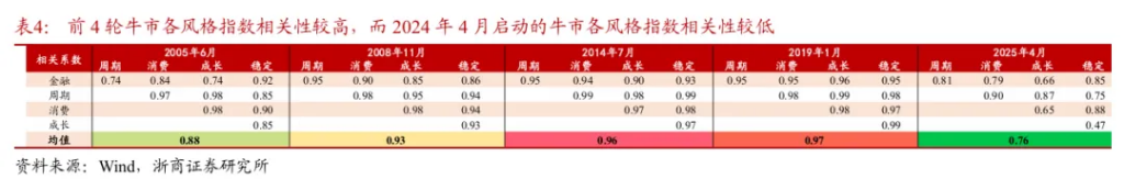 市场节奏而言,各大风格和行业指数在前四轮牛市启动前后三个月,走势较为同步,而本轮牛市启动前后走势相关性较低,或体现为“慢”牛行情。统计2005年1月初至今中信五大风格指数累计涨跌幅,计算每轮牛市启动前后三个月累计涨跌幅的相关性,以每轮5大风格指数之间相关系数的均值衡量风格指数走势的相关性,相关系数均值越大,走势越一致;相关系数均值越小,走势越分化。以2005年6月启动的牛市为例,计算五大风格之间的相关性,均值为0.88。以此类推,第二轮至五轮牛市启动前后各指数相关系数平均值分别为0.93、0.96、0.97和0.76,本轮牛市风格指数走势较分化。同理,计算申万31个行业各轮牛市启动前后的相关系数,进而求平均值分别为0.80、0.84、0.91、0.88和0.50,本轮牛市中各行业走势分化程度较大。基于本轮牛市风格和行业指数走势分化的现象,我们推测各个指数共振向上难度较大,上证指数大概率呈现“慢”牛走势。