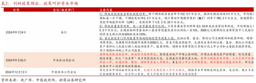 利好政策出台,呵护资本市场:2024年9月24日,央行举行新闻发布会,公布三大重磅政策,包括降低存款准备金率和政策利率、降低存量房贷利率,统一房贷最低首付比例、首次创设专门针对股票市场的结构性货币政策工具(互换便利和股票回购、增持专项再贷款),为本轮牛市提供“政策支持”以及“流动性宽松”支持。2024年9月中央政治局会议和2024年12月的中央经济工作会议,分别提到“要努力提振资本市场,大力引导中长期资金入市”、“打通中长期资金入市卡点堵点”。