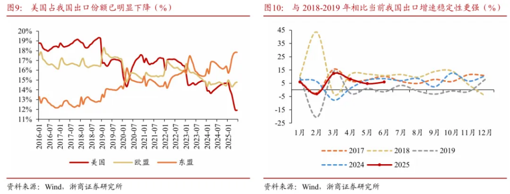 第三,中国在全球价值链上的地位不断提升+产品附加值持续提高,使得我国对经贸摩擦的抗风险能力更强。2018年1月至2025年6月,家具、玩具、服装“老三样”出口占比下降了3.1pct,而电动汽车+太阳能电池、集成电路出口占比分别上升了1.8pct、2.0pct。高附加值产品出口份额不断提升,增强了我国在全球贸易中的竞争力,且我国的产业链和技术优势短期内较难被东南亚等供应链转移目的地所替代。