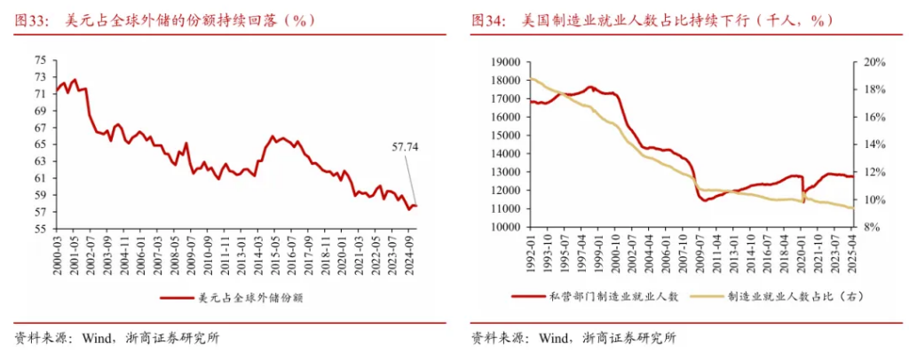 国际格局正在寻找新秩序。美国长期以经常账户逆差的形式向全球输出美元、征收全球铸币税,并通过资本账户顺差实现美元回流。2024年,美国经常账户逆差达到1.19万亿美元的历史极值,同年资本账户当中外资持有美债规模新增5731亿美元。尽管美国充分享受着美元霸权带来的利益,但长期的贸易逆差也使得美国经济和产业逐渐空心化,“脱实向虚”情况愈发严重。与此同时,部分经济体经历了“美元潮汐”的冲击之后逐步将储备资产从美元分散到其他货币和资产上以提高抗风险能力。持续的产业空心化、美元地位弱化、财政负担不断加重等因素,正在加剧美国经济的脆弱性,美元霸权的根基逐渐松动。2000年至2025Q1,美国私营部门制造业就业人数占比从15.7%降至9.4%,美元占全球外储份额比重从71.5%降至57.7%。