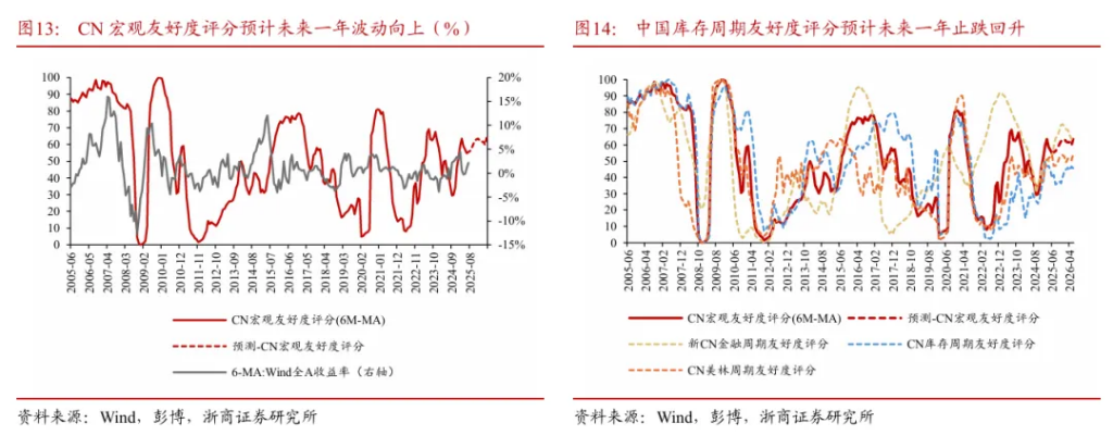 A股所处宏观环境趋于改善。我们在前期报告《股债双牛+AH同涨的持续性几何》中详细解释了描述A股所处宏观环境状态的独家指标“CN宏观友好度”。基于彭博宏观一致预期数据,预计未来一年中国金融周期在中高位波动、库存周期止跌回升、美林周期趋于震荡。适配A股的宏观友好度评分指标总体在波动中改善,指向A股具有较好的基本面支撑。