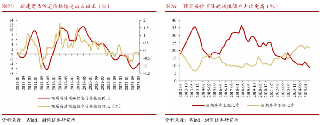1)地产方面,2021年年中开始,房地产进入下行周期,地产投资、新开工、销售、价格增速均出现较为陡峭的下滑。截至2025年6月,70城新建住宅价格指数同比仍未转正(-3.7%),自2022年4月以来连续39个月为负,部分城市房价跌幅明显。在以往“买涨不买跌”的惯性思维模式下,房价长期下跌叠加库存去化较慢、人口负增长、收入预期偏弱等因素,或导致房地产的投资属性较过去明显弱化。