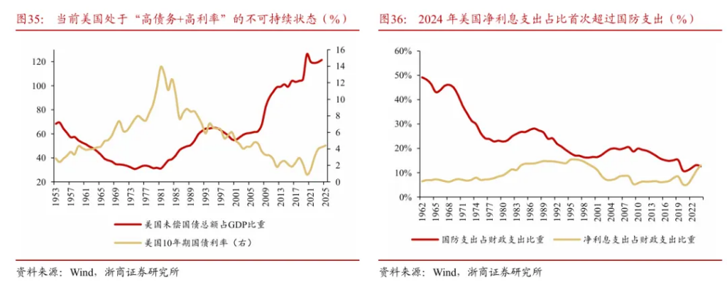 美国的财政负担和长期债务愈发沉重且不可持续。1960年代以来,美国净利息支出占全部财政支出比重始终低于国防支出。但2024年,美国净利息支出占比(13.1%)首次超过国防支出(12.6%),且伴随债务上限的提高叠加高利率环境,未来净利息支出占比可能进一步抬升。美国国会预算办公室(CBO)今年7月发布的最新评估显示,“大美丽法案”将在未来10年增加美国财政赤字约3.4万亿美元,且增量财政赤字将于2026-2029年达到阶段性峰值。截至2024年末,美国未偿还国债总额占GDP比重为121.5%,未来伴随财政负担的进一步加重、持续不下的高利率环境,美债利息偿付压力或持续处于紧绷状态,进而损伤美元信用,美元资产(特别是美债)作为全球避险资产的“光环”可能逐步褪去。