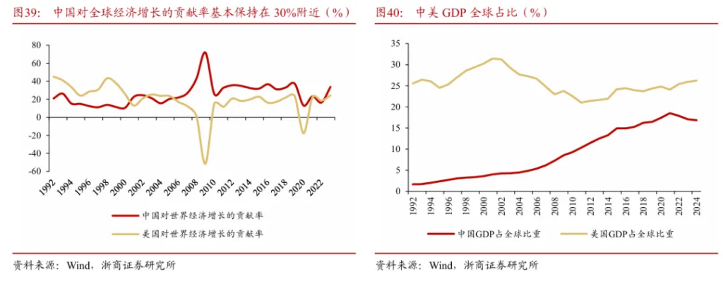 “中国崛起”的趋势不仅仅体现为纸面上中美GDP增速的此消彼长,更重要的是发展动能、治理模式、经济结构的深刻重构。一方面,我国拥有全球最完整的产业体系,是唯一拥有联合国产业分类中全部工业门类的国家;500种主要工业产品中,四成以上产品产量位居全球第一,奠定了中国崛起的物质基础。另一方面,在美国挑起逆全球化、孤立主义,不断“退群”破坏国际治理的背景下,中国积极参与全球治理,深化全球发展合作,展现负责任大国形象。此外,我们在前期报告《关税冲击,是“危”更是“机”——论当前形势与2018年差异》中提到,当前中国经济结构转型蹄疾步稳,新动能持续强化,经济内力已较过去有明显增强,抵御外部风浪的韧性不可同日而语。