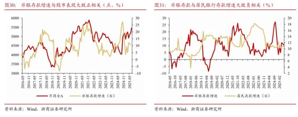 最后,股市的财富效应或对银行存款入市产生“正向循环激励”,市场回暖有望带动部分存款分流至股市。历史上,非银存款增速与股指表现存在大致的正相关关系、与居民银行存款增速存在大致的负相关关系。以“924行情”为例,2024年9月至11月,万得全A指数月均值从4049点涨至5163点;当年8月至10月,非银存款增速从18.4%升至27.3%,上交所A股新增开户数从近100万户飙升至684.7万户,同一时期居民银行存款增速则有所下行。2021年、2019年中至2020年初、2017年也均出现过类似情况。