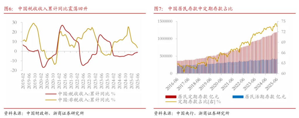 政策提振实体信心,税收收入累计同比降幅收窄,居民定期存款占比或难再大幅上行。据财政部,2024年7月-2025年6月中国税收收入累计同比降幅收窄,由-5.4%收窄至-1.2%。据中国央行,2025年6月居民存款中定期占比为73.53%,较前值下降0.9pct,或指向居民投资偏好伴随政策转向而有所抬升。