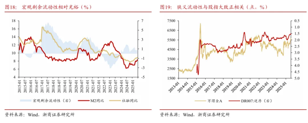 从先行指标来看,M2领先于M1,M1与股指基本同步甚至略微领先。2025年6月,M1、M2较前值分别回升2.3pct、0.4pct,宏观剩余流动性(社融-M2)为+0.6%,反映宏观流动性环境较为宽松。