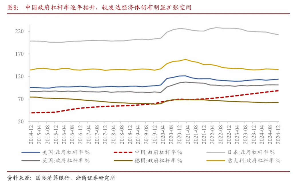 中国政府杠杆率较发达经济体存在明显提升空间。截至2024年12月,中国政府杠杆率为88.4%。对比而言,日本 、意大利、美国、法国及英国对应政府杠杆率分别为212.5%、135.5%、114.1%、113.1%和101.4%。