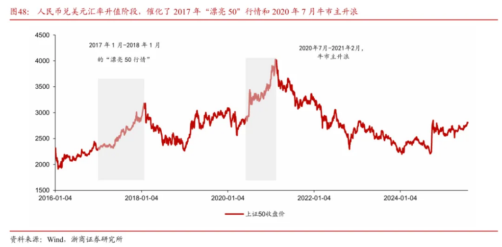 汇率升值+技术走势=“系统性牛市”。1)汇率因素:人民币兑美元汇率步入稳定升值节奏;2)技术走势:上证走势超预期令市场中枢抬升,中长期目标点位或已不再局限于挑战2024年10月8日高点附近。