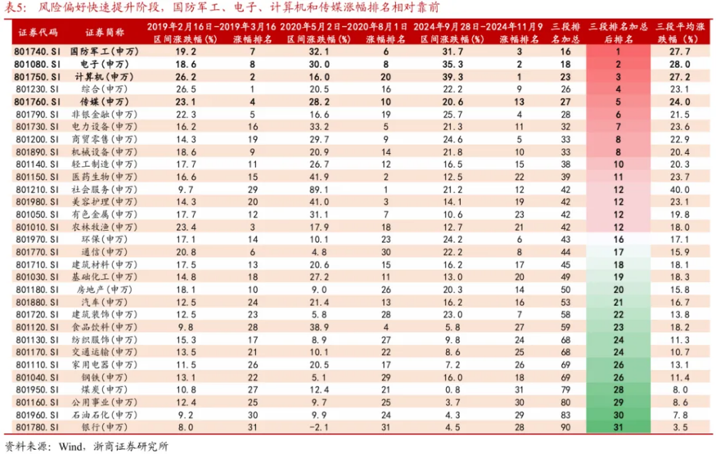 风险偏好快速提升阶段,国防军工、电子、计算机和传媒充分受益。以两融余额周度环比变动MA5衡量风险偏好,我们定义两融余额周度环比变动MA5从负值上升至4%左右为风险偏好快速提升阶段。2016年以来,共有三个区间,分别为2019年2月16日至2019年3月16日,2020年5月2日至2020年8月1日,2024年9月28日至2024年11月9日。统计申万一级行业在上述三个阶段各自涨跌幅排名加总后的排名,靠前的为国防军工、电子、计算机和传媒,前三阶段的涨跌幅平均值分别为27.7%、28%、27.2%和24%,涨幅较大,表明在风险偏好快速提升阶段,上述四大行业充分受益。