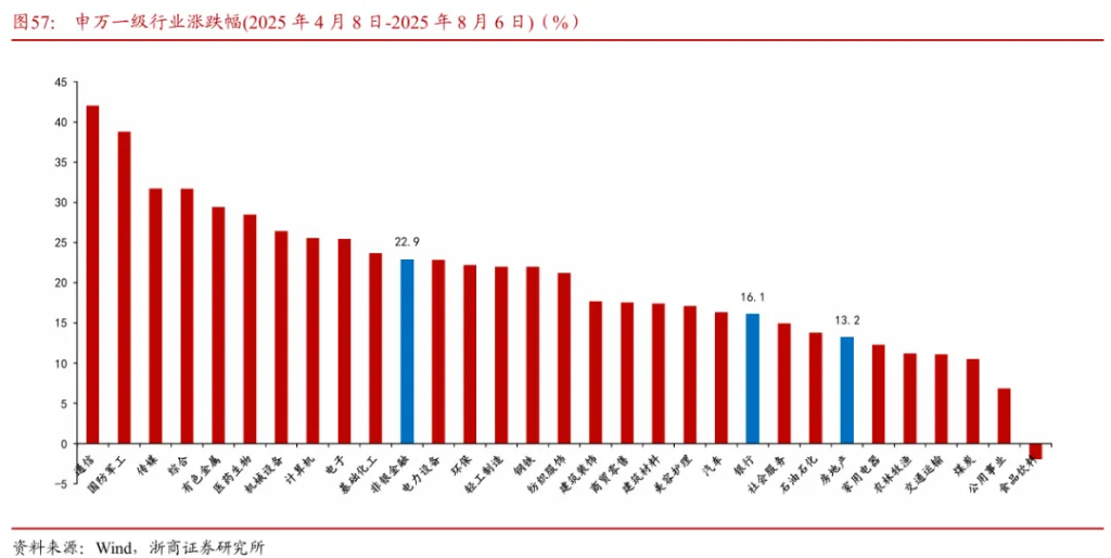 房地产:政策定调边际变化,增量政策可期;大金融滞涨板块,赔率较为合适。1)政策定调: 2025年4月中央政治局会议,提到“持续巩固房地产市场稳定态势”,2025年7月国家统计局发布2025年上半年全国房地产市场基本情况,提到“需要下更大力度推动房地产市场止跌回稳”。中央对房地产止跌回稳表态从“持续巩固”调整为“更大力度”,增量政策值得期待。2)大金融滞涨板块:2025年4月8日至2025年8月6日,大金融板块中非银金融上涨22.9%,银行上涨16.1%,房地产仅上涨13.2%,涨幅相对靠后。申万一级行业而言,房地产板块涨幅仅排名第25,涨幅同样靠后。在政策定调发生边际变化的背景下,增量政策或可期,房地产有望迎来补涨行情。