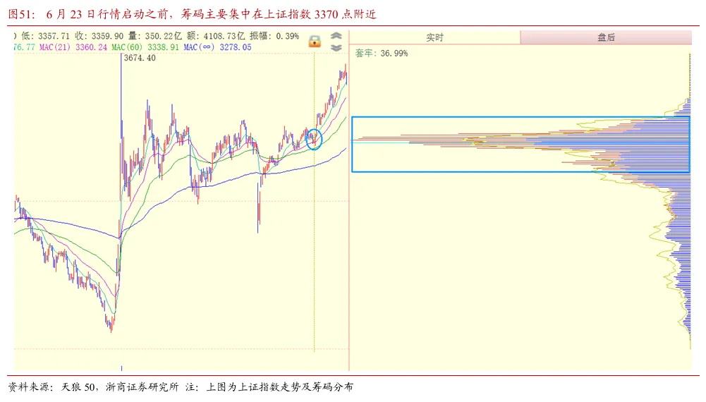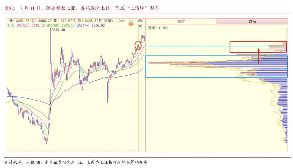 上证指数筹码结构呈现“上滚峰”形态,或形成“慢”牛走势。上证指数在6月23号行情启动之前,筹码主要集中在3370点附近,呈现出类似尖峰正态的分布(如蓝框所示)。随着上证指数以45度角匀速上涨,蓝框部分的筹码逐步上移至红框部分,但并未发散。在均线多头排列向上发展的情况下,如果保持这种角度均匀上涨,筹码缓慢上移,表明入场的人较多,不断形成换手,对应的获利盘兑现压力相对较小,有可能形成“慢”牛走势。