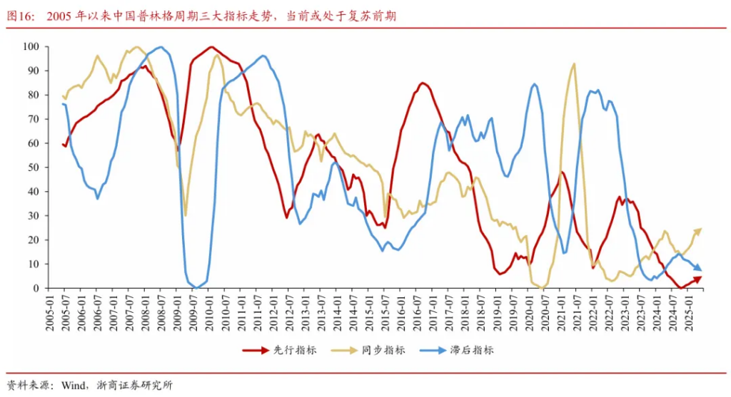 当前先行和同步指标上行、滞后指标下行,指向经济或处于普林格周期2阶段复苏前期,此时股票和债券均受益。