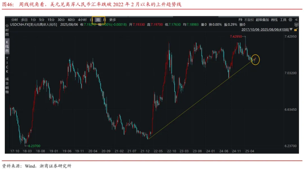 周线和月线视角看,人民币兑美元汇率走到长周期上涨边缘,复盘历史,人民币兑美元汇率趋势性升值阶段,容易形成A股的趋势性行情。1)周线看:截至2025年8月5日,美元对人民币离岸汇率跌破2022年2月以来的上升趋势线,人民币近期兑美元的强势或可解释近期A股市场震荡上行。2)月线看:美元兑人民币离岸人民币指数出现月线MACD顶部背离结构,且已经跌破了2022年2月以来的上升趋势线(黄色线段),或表明人民币汇率处于长周期上涨的边缘。复盘历史,人民币兑美元汇率在2017年1月-2018年3月和2020年6月-2021年6月趋势性升值,分别催化了2017年1月-2018年1月的“漂亮50”行情和2020年7月形成的牛市主升浪。现阶段,人民币兑汇率处于长周期上涨边缘,人民币升值或使得中国资产吸引力提升,有望推动A股市场走牛。