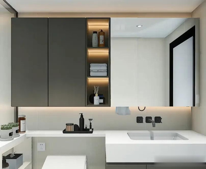 上方装通长镜柜,镜柜内可以分层收纳护肤品、牙刷,外面是镜子,既能整理妆容,又能藏起杂物,收纳需求全满足。