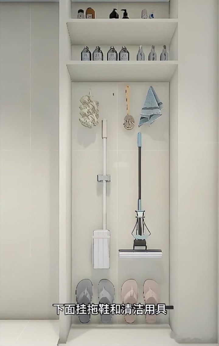 卫生间收纳不够?利用墙面空间更省地。在淋浴区对面砌一面薄墙,墙中间留空做置物架 ——上面放洗发水、沐浴露,不用再装壁挂架占空间;下面留空挂拖鞋、放清洁工具,拿取方便还不占地。